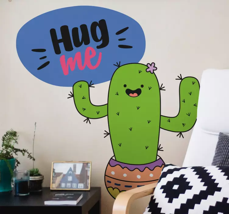 Referentienummer: A46921Een vrolijk cactuspersonage met een vriendelijke glimlach, versierd met een levendige bloem en een kleurrijke pot. Het heeft een speelse spraakwolk met de tekst die aanmoedigt tot "hugs", wat een luchtige toets aan het geheel toevoegt.