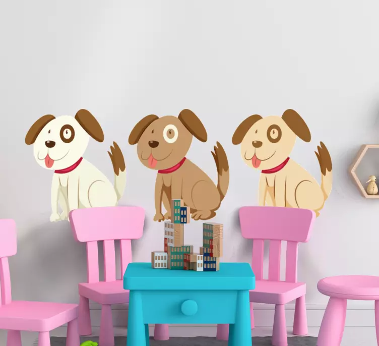 Referentienummer: A48962Een charmante trio van speelse puppy's in cartoonstijl, elk met unieke kenmerken en uitdrukkingen. Dit ontwerp brengt een vrolijke sfeer, perfect voor kinderruimtes, aantrekkelijk voor dierenliefhebbers en creëert een levendige vibe.