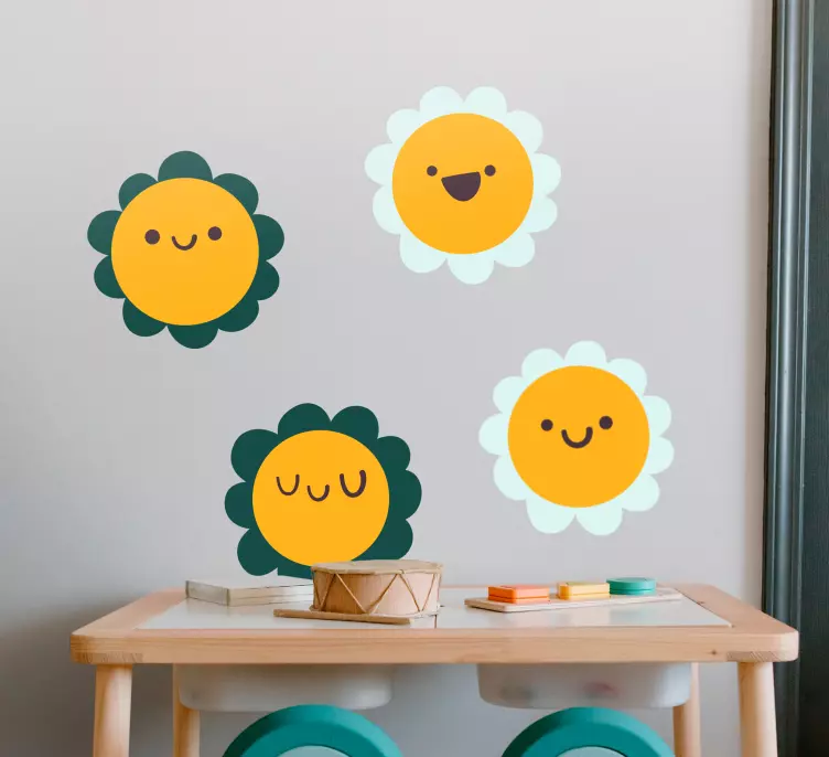 Referentienummer: A48406Heldere en vrolijke ontwerpen met blije bloemfiguren. Elke bloem heeft een unieke uitdrukking, wat een gevoel van speelsheid en vreugde aan elke ruimte toevoegt. Ideaal voor kindvriendelijke omgevingen, deze elementen bevorderen creativiteit en een warme sfeer.