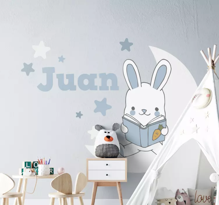 Referentienummer: A51047Een speelse ontwerp met een charmante bunny die een boek leest, omringd door sterren en een halve maan. Perfect om de ruimte van een kind te personaliseren, dit speelse thema moedigt jonge lezers aan en voegt een vleugje magie toe aan de kamer.