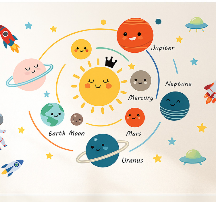 Referentienummer: A54265Breng een sprankje magie in de kinderkamer met onze Muursticker kinderkamer planeet muur kids. Dit prachtig ontworpen product laat je kleine astronauten de sterren en planeten ontdekken, met felle kleuren en schattige ontwerpen die elke muur een speelse uitstraling geven. De satijnen afwerking zorgt ervoor dat het licht prachtig weerkaatst, zonder verblinding, terwijl de intensiteit van de kleuren de verbeelding stimuleert. De sticker is eenvoudig schoon te maken met een vochtige doek en een beetje neutrale zeep, wat hem perfect maakt voor een drukke kinderkamer!