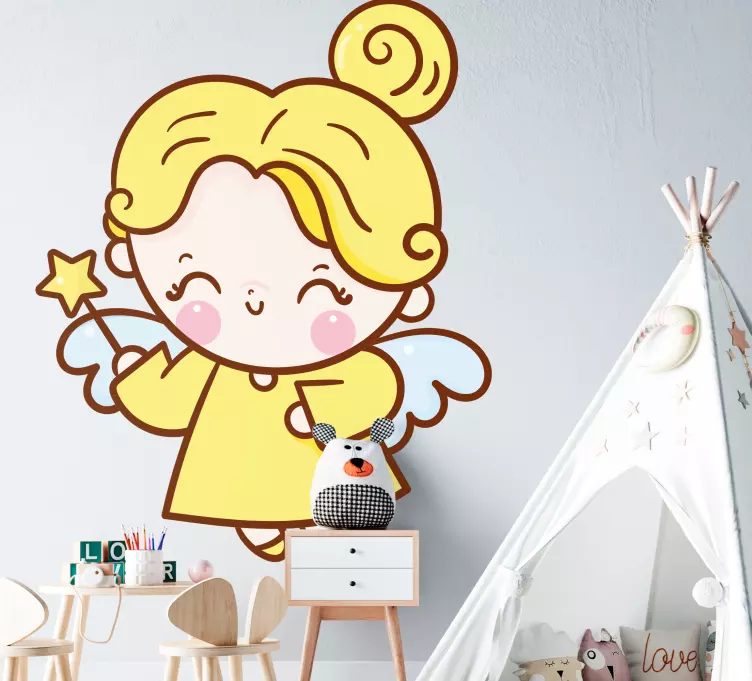 Breng een vleugje magie in de kinderkamer met onze Muursticker kinderkamer schattig engel karakter. Dit ontwerp toont een lachend, grillig engeltje met een toverstok in een stralende gele kleur. De speelse uitstraling van deze fee maakt het een perfect decoratief element dat kinderen zal betoveren en hun fantasie zal stimuleren.