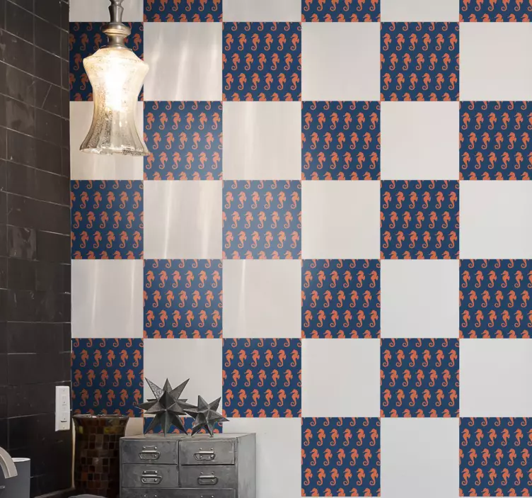 Referentienummer: A47028Een boeiend zeelevenmotief met zeepaardjes in verschillende posities tegen een diepblauwe achtergrond. Dit ontwerp verrijkt ruimtes met zijn speelse aquatische thema, ideaal voor het creëren van een serene en levendige sfeer die doet denken aan oceaanavonturen.