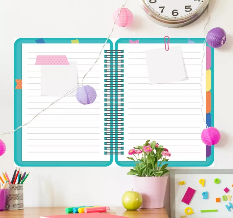 Referentienummer: A9024Wordt georganiseerd met deze grote sticker! gemakkelijk van toepassing zijn op uw muur en op tekenen vrij met de pen voorzien. Noteer uw belangrijke herinneringen en afspraken, veel effectiever dan pen en papier! Een decoratief ontwerp van een notebook met verschillende gekleurde tabs. Ideaal voor slaapkamers of kantoorruimtes.Onze producten worden gemaakt van vinyl. Dit materiaal van hoge kwaliteit zorgt ervoor dat de stickers gemakkelijk strak aan te brengen zijn op elk glad oppervlakte binnen huis. Mocht u besluiten de sticker te verwijderen van de muur dan laat deze geen zichtbare sporen na. Slechts eenmaal te gebruiken. Daarnaast bepaald u zelf in welke afmetingen en kleuren u de sticker wilt ontvangen