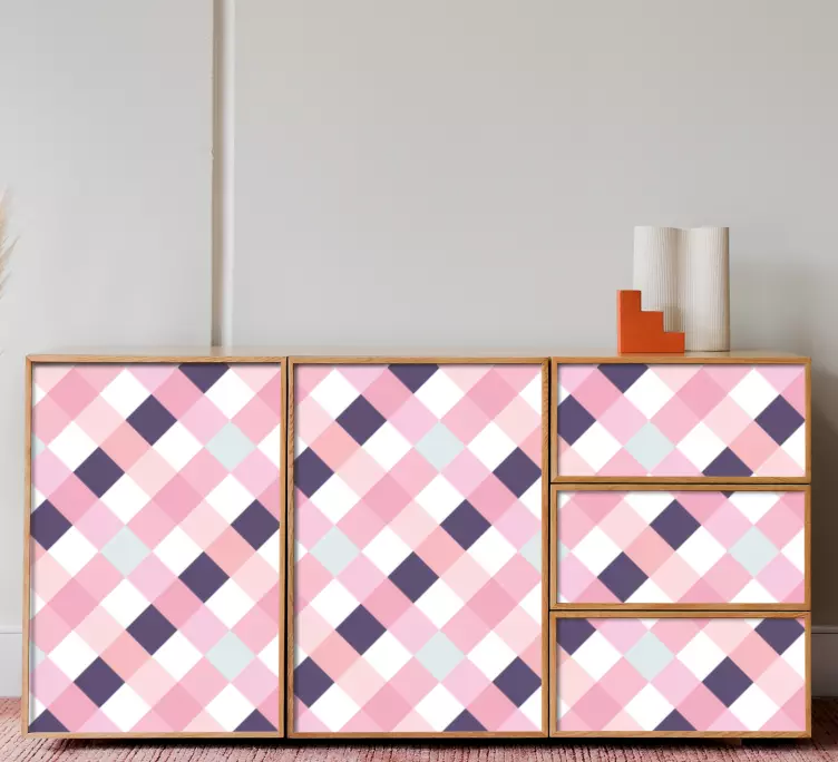 Transformeer uw interieur met onze Object sticker roze patroon oppervlak. Dit prachtige ontwerp bevat een geruit en geometrisch patroon dat een speelse en moderne uitstraling biedt. De kleurrijke textuur, perfect voor meubilair en lades, laat uw huisdecoratie stralen en voegt een fris accent toe aan elke ruimte.