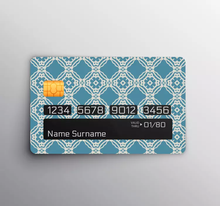 Ontdek de prachtige Pinpas sticker met patroon voor creditcard die een uniek grafisch ontwerp heeft met antieke tegels in een schitterende blauwe kleur. Het geometrische patroon en de subtiele textuur geven deze sticker een sierlijke uitstraling, perfect voor het personaliseren van uw kredietkaart. Maak een statement met deze stijlvolle toevoeging aan uw financiële accessoires!