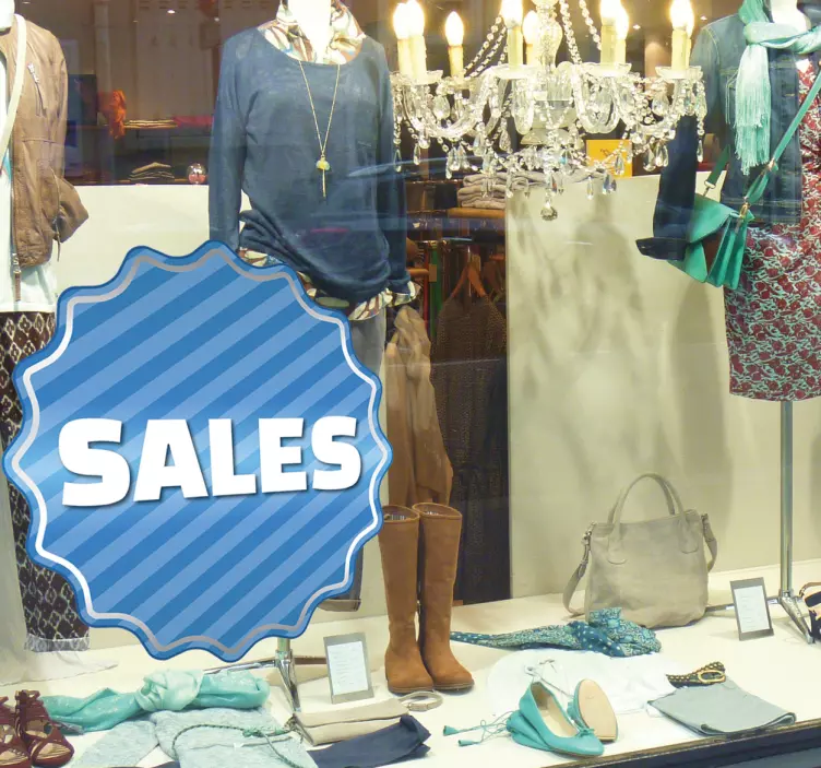 Een leuke muursticker of raamsticker in de vorm van een blauwe gekartelde cirkel is zeer geschikt om de aanbiedingen van uw winkel in de kijker te zetten. Deze sticker is personaliseerbaar, Uw kunt de gewenste tekst/naam aanpassen en invoeren onder de