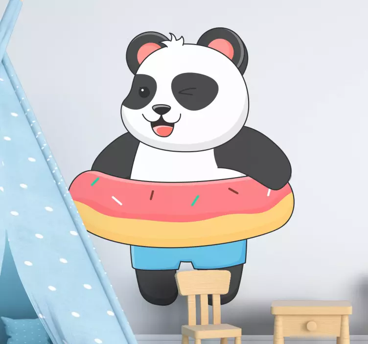 Referentienummer: A46909Een speelse panda wordt afgebeeld terwijl hij geniet van een donut, wat een vrolijke sfeer uitstraalt. Het charmante ontwerp heeft felle kleuren en een humoristische uitdrukking, waardoor het perfect is voor kinderruimtes. Dit ontwerp roept gevoelens van vreugde en plezier op, ideaal voor het creëren van een levendige atmosfeer.