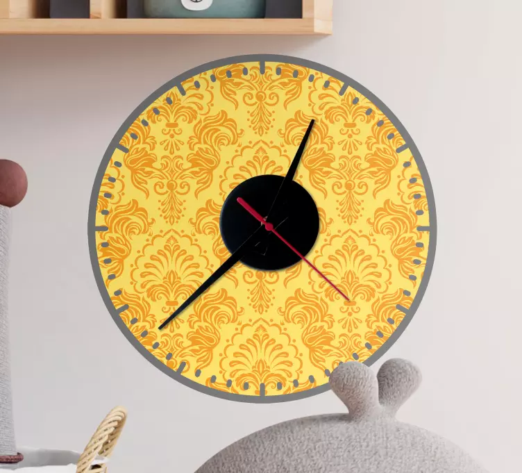 De Sticker klok elegante bloemen tijdmeter is een prachtig grafisch ontwerp dat een harmonieus samenspel van damastpatronen en delicate bloemen in een warme gele tint biedt. Deze ronde kloksticker is perfect voor het creëren van een elegante sfeer in jouw interieur. Met dit uurwerk breng je niet alleen stijl, maar ook functionaliteit aan je muur.