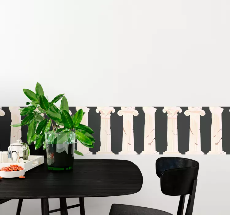 Transformeer uw interieur met de Stickerrand klassiek kolomontwerp, die een elegant en traditioneel antiek Grieks design uitstraalt. Dit prachtige ontwerp met kolommen op een zwarte achtergrond geeft een marmeren uitstraling die perfect past in elke ruimte. Het is een statement piece dat de schoonheid van uw muren accentueert en een gevoel van luxe toevoegt aan uw woning.