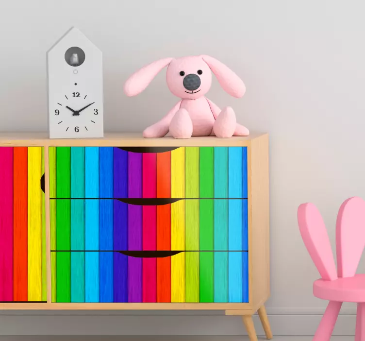 Creëer een levendige sfeer in uw interieur met onze unieke Vormen muursticker levendige verticale lijnen. Dit prachtige ontwerp, geïnspireerd door een kleurrijke regenboog, straalt een speelse energie uit. Met een hout-effect dat doet denken aan planken en een abstract patroon van veelkleurige strepen, voegt deze sticker een dynamisch element toe aan uw meubilair. Laat uw muren sprankelen met deze levendige en moderne uitstraling!
