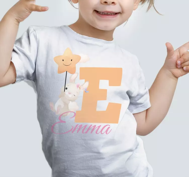 Referentienummer: T4701Dit charmante ontwerp toont een blije konijn met een ster ballon, vergezeld van de letter 'E' en een gepersonaliseerde naam. Perfect voor speciale gelegenheden, straalt het vreugde en speelsheid uit, waardoor het een ideale keuze is voor kleintjes.