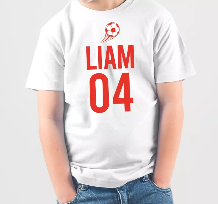Referentienummer: T4113Dit ontwerp heeft een levendig voetbalthema, met de naam 'Liam' naast het nummer '04'. De kleuren zijn opvallend met gedurfde rode tinten tegen een witte achtergrond, perfect voor jonge voetbalfans.