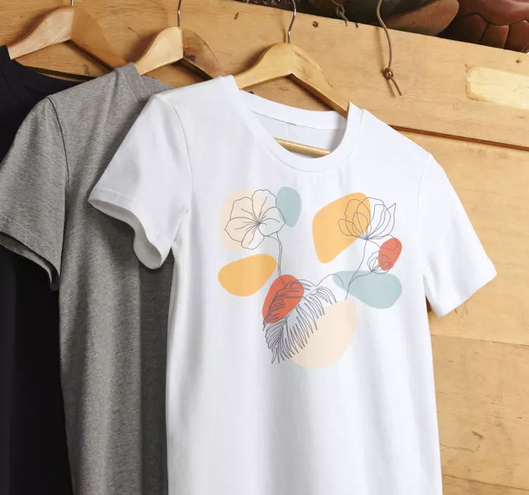 Dit betoverende ontwerp bevat een bloemcompositie met zachte kleuren en elegante lijntekeningen. De mix van pastelkleuren creëert een harmonieuze visuele aantrekkingskracht, perfect voor verschillende gelegenheden. Ideaal voor degenen die moderne esthetiek en stijlvolle eenvoud in hun garderobe waarderen.