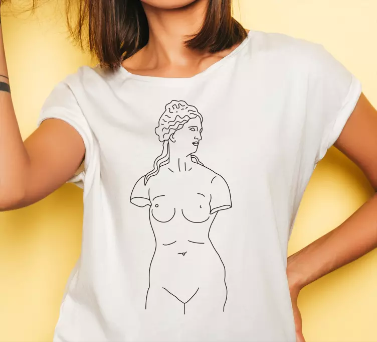Dit T-shirt elegante vrouwelijke silhouet is een prachtige combinatie van kunst en mode. Het ontwerp is geïnspireerd op de oude Griekse standbeelden en vangt de schoonheid van de vrouwelijke vorm in een unieke lijnkunst. Dit culturele portret heeft een abstracte en artistieke uitstraling, perfect voor de moderne vrouw die op zoek is naar iets minimalistisch maar toch stijlvol!