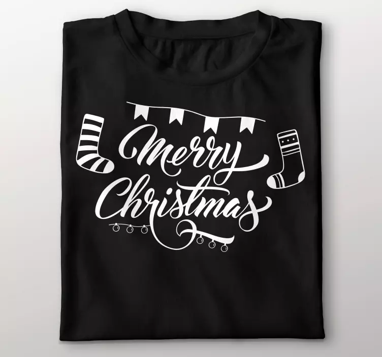 Referentienummer: T4656Dit opvallende ontwerp bevat de tekst 'Merry Christmas' in elegante letters, vergezeld van feestelijke patronen zoals sokken en decoratieve elementen, die de geest van viering tijdens het feestseizoen belichamen.
