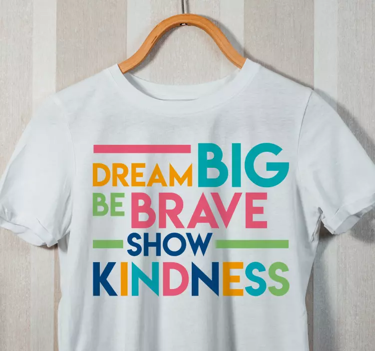 Referentienummer: T4142Dit ontwerp bevat inspirerende woorden in levendige kleuren, die positiviteit en vriendelijkheid aanmoedigen. De boodschap, vormgegeven met speelse typografie, resoneert met kijkers en maakt het perfect voor het koesteren van een ondersteunende sfeer. Ideaal voor degenen die geloven in het verspreiden van hoop en aanmoediging door middel van hun stijl.