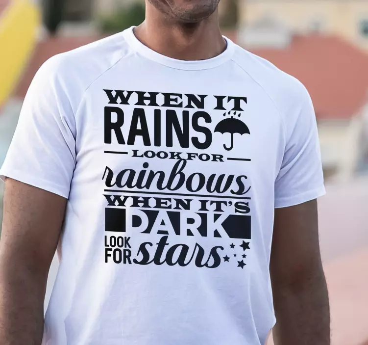 Ontdek ons prachtige T-shirt inspirerende positieve kijk, dat een sprankelende mix van elementen bevat zoals regen, regenboog, sterren en krachtige citaat spreuken. Het ontwerp is een ware uiting van positief denken en inspiratie, perfect voor iedereen die een motiverende boodschap wil uitstralen. Dit t-shirt is niet alleen een modeartikel, maar ook een krachtige uitdrukking van je levenshouding!