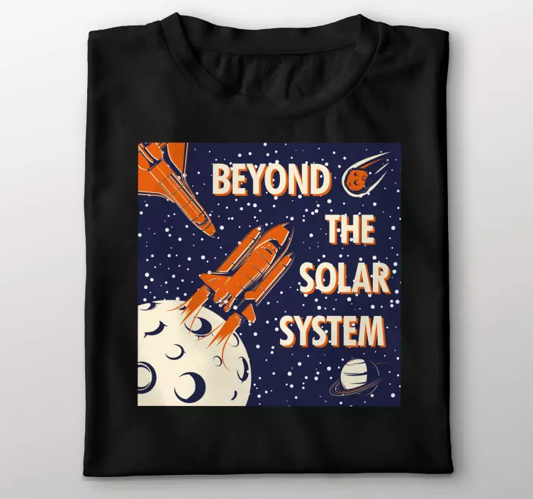 Referentienummer: T4800Dit ontwerp bevat een meeslepende avontuur in de ruimte, met een raket die voorbij planeten en een maan vliegt. De levendige kleuren en gedurfde typografie nodigen uit tot verkenning en nieuwsgierigheid naar de kosmos, waardoor het een aantrekkelijke keuze is voor iedereen die gefascineerd is door "space travel".