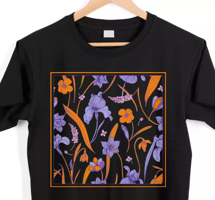 Dit T-shirt met bloemmotief elegantie is een prachtig voorbeeld van grafisch design waarbij kleurrijke illustraties van krokussen en andere bloemen samenkomen. Met een levendig palet van oranje en purper brengt dit shirt de natuur tot leven, waardoor het een echte blikvanger is. De bloeiend bloemkunst op dit shirt biedt een speelse maar elegante uitstraling die perfect is voor elke gelegenheid. Laat je omringen door de schoonheid van planten en bloemen met dit unieke ontwerp!