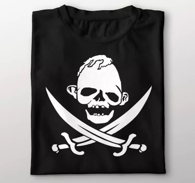 Referentienummer: T4941Dit opvallende ontwerp bevat een griezelige piratenschedel met een ondeugende glimlach en gekruiste zwaarden. Tegen een gedurfde zwarte achtergrond, roepen de opvallende witte graphics Halloween-thema's op, waardoor het perfect is voor leuke en speelse gelegenheden. Ideaal voor degenen die van avontuurlijke stijlen houden.