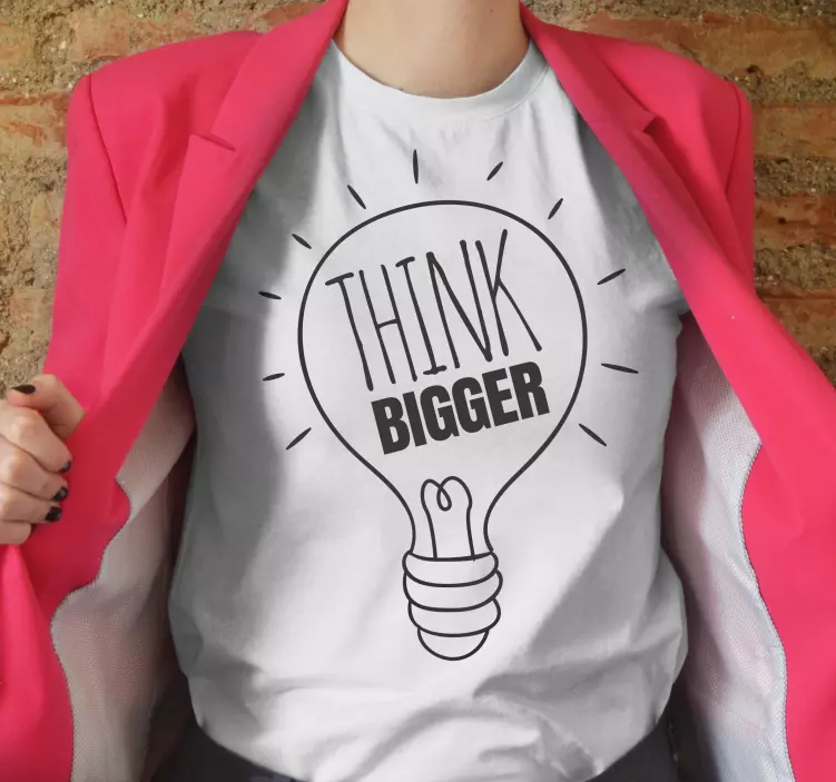 Referentienummer: T4862Dit ontwerp toont een gloeilamp met de tekst 'Think Bigger' in vette letters. De afbeelding roept een gevoel van inspiratie en positief denken op, met eenvoudige maar krachtige visuals die aansluiten bij een motiverend thema.