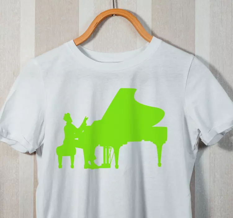 Ontdek ons prachtige T-shirt piano performer silhouet, dat een elegant silhouet van een pianist toont te midden van een muzikale achtergrond. Dit ontwerp straalt creativiteit en passie uit, perfect voor elke muzikant of muziek liefhebber! Met een combinatie van piano-instrumenten en artistieke flair, is dit shirt een must-have voor iedereen die zijn liefde voor muziek wil uitdragen.