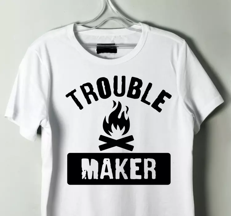 Referentienummer: T5448Dit opvallende ontwerp bevat vetgedrukte tekst met de woorden 'Trouble Maker', vergezeld van vlam- en kampvuur symbolen. Het is perfect voor degenen die een leuke en avontuurlijke geest omarmen. Het contrast van zwart op wit voegt een element van opwinding toe en trekt moeiteloos de aandacht.