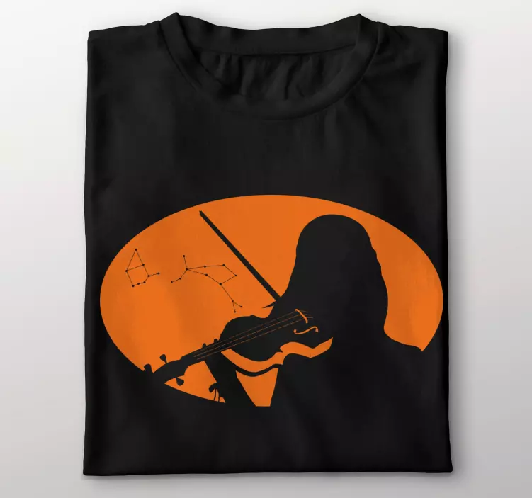 Referentienummer: T4530Dit opvallende ontwerp toont een silhouet van een violist onder een sterrenhemel met sterrenbeelden op de achtergrond. De levendige oranje cirkel contrasteert prachtig met de zwarte stof, waardoor het een perfecte keuze is voor muziekliefhebbers. Ideaal voor speciale gelegenheden of casual wear.