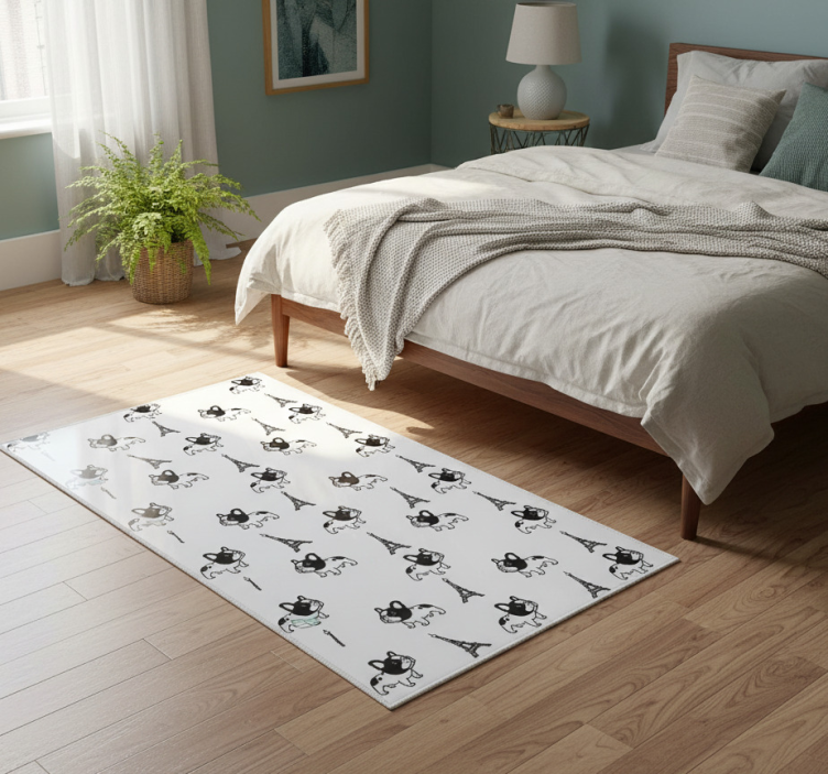 Referentienummer: R21788Breng de charme van Parijs direct in uw slaapkamer met ons vinyl tapijt slaapkamer franse bulldog in parijs. Dit prachtige ontwerp toont een schattige Franse bulldog die door de straten van Parijs wandelt, omringd door iconische bezienswaardigheden. De levendige kleuren en gedetailleerde illustraties creëren een vrolijke en uitnodigende sfeer, perfect voor elke hondenliefhebber en een geweldige manier om een persoonlijke touch aan uw interieur toe te voegen!
