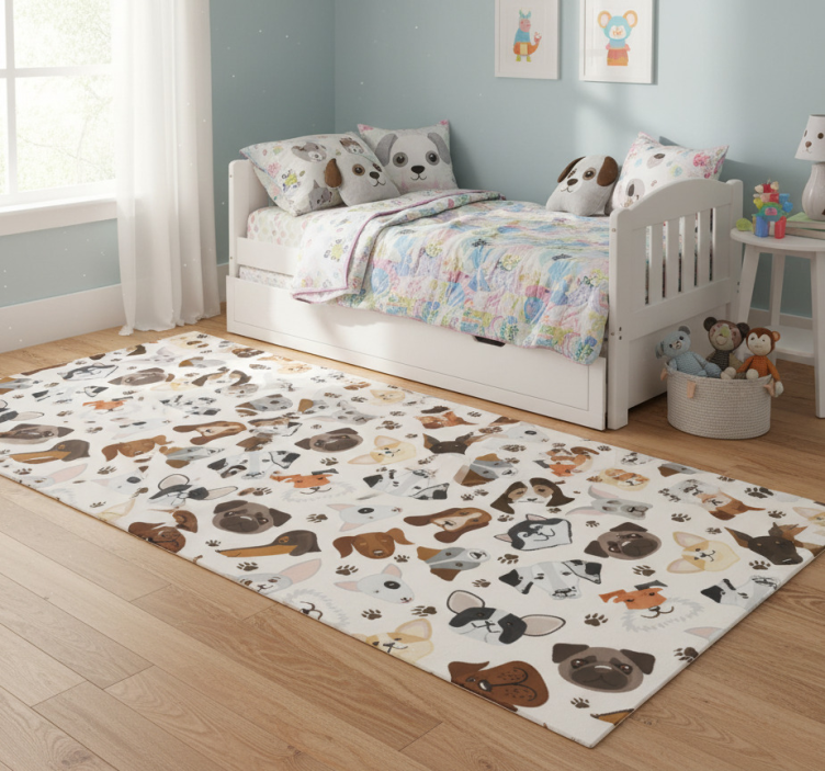Referentienummer: R21836Breng een vrolijke sfeer in jouw slaapkamer met ons Vinyl tapijt slaapkamer schattig puppy en hond patroon. Dit schattige ontwerp, dat bestaat uit leuke puppy’s en blije honden, voegt een speelse en gezellige uitstraling toe aan elke ruimte. De combinatie van levendige kleuren en schattige afbeeldingen zorgt ervoor dat dit tapijt niet alleen functioneel is, maar ook een decoratief pronkstuk in jouw slaapkamer vormt.